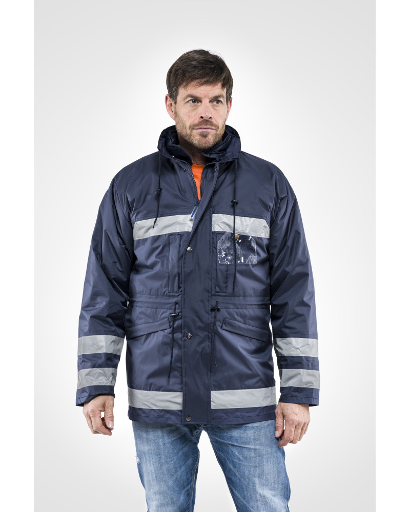 - Parka Urban Blu Navy - Caratteristiche principali:Materiale esterno: 100% poliestere spalmato PVCImbottitura: 180 g/m² Masterpoly, per un buon isolamento termicoColore: Blu NavyTaglie disponibili: S, M, L, XL, XXLConfezione: 1 pezzo, box da 10 pezziDPI: 1ª categoriaChiusura: Cerniera e bottoniCoulisse in vita: Per una regolazione ottimaleTasche esterne: 4 tasche con cerniera, con porta badgePolsini: Elasticizzati internamente per miglior isolamentoBande riflettenti: Posizionate attorno al torace, al fondo e ai polsi per una maggiore visibilità Interno staccabile: Con bande in materiale Husky per comfort aggiuntivoUso ideale: Sicurezza, visibilità e protezione in condizioni climatiche difficili