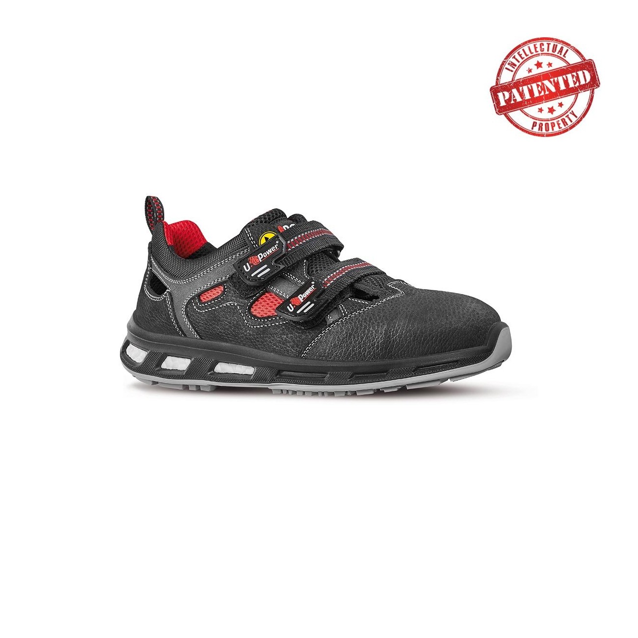 Scarpe antinfortunistiche basse, leggere e comode u power della linea Red Lion, totalmente "metal free", con tomaia in pelle nabuk naturale bottalato, idrorepellente, traspiranti, puntale composite, antiperforazione, antiscivolo e suola PU/PU infinergy S1P SRC, ESD