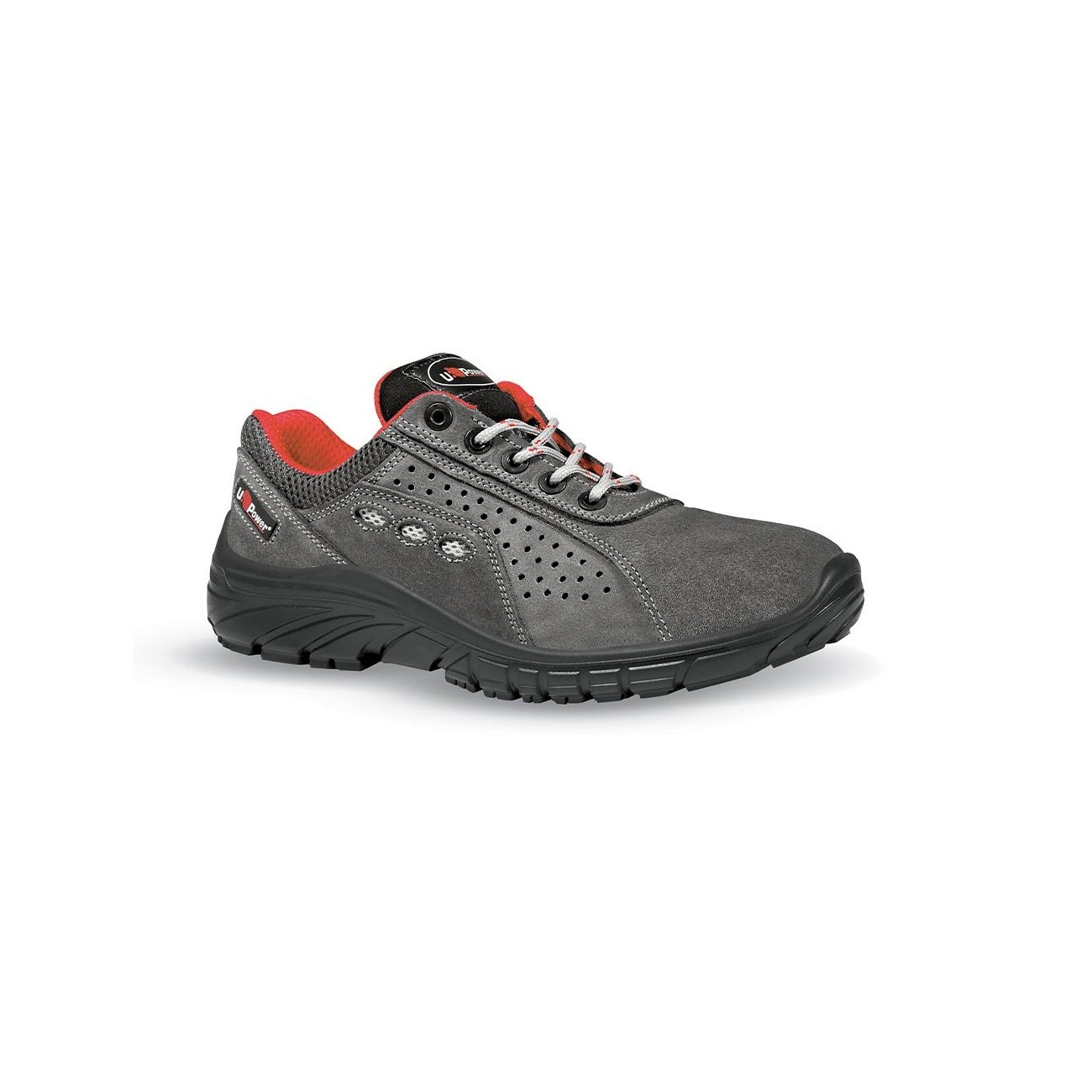 Scarpe antinfortunistiche basse totalmente "no metal", comode e leggere u power della linea Professional, con tomaia in pelle Nabuk naturale bottalato idrorepellente, puntale Golia 0 Joule, antistatiche, resistenti agli idrocarburi e oli, antiscivolo e suola PU/PU, 01 FO SRC
