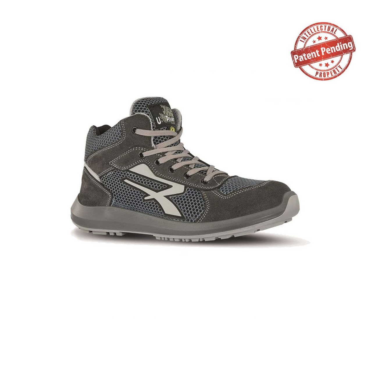 Scarpe antinfortunistiche alte, leggere e comode U-Power della linea Red UP, con tomaia in nylon ultra traspiranti e morbida pelle scamosciata, puntale in alluminio, antiperforazione, antiscivolo e suola PU/PU High Rebound in Elastopan di Basf , S1P SRC ESD