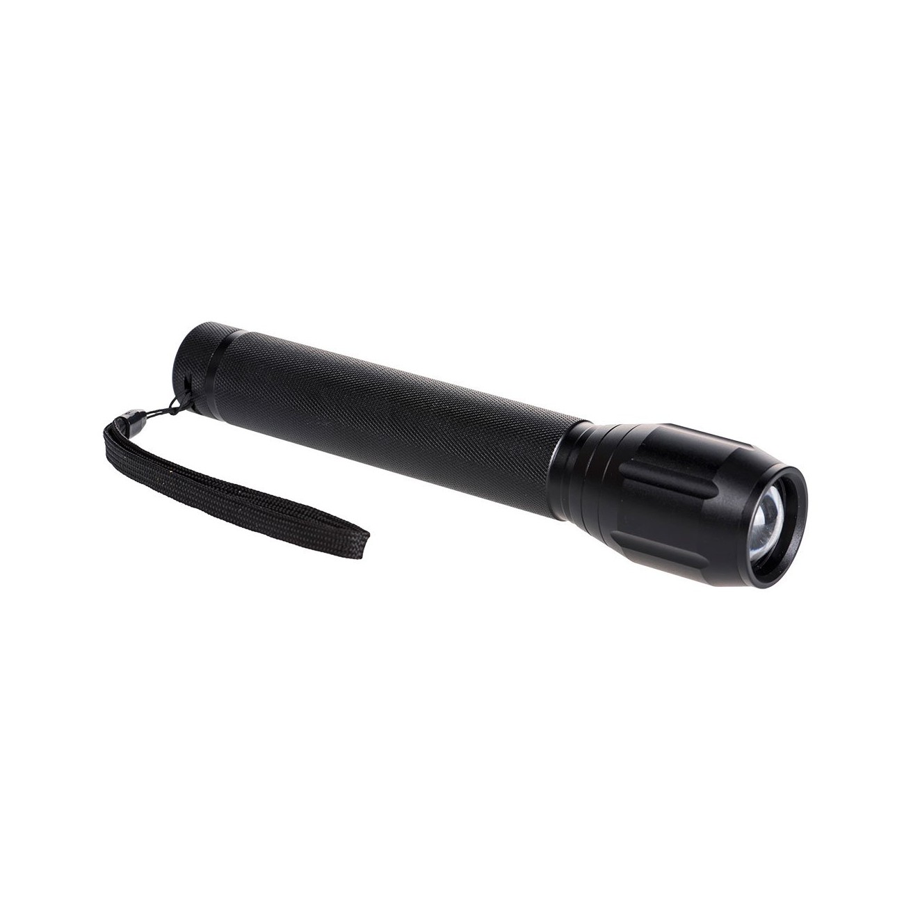 Torcia portatile altamente efficiente e multifune con zoom. La resistente struttura in alluminio offre un\'eccellente resistenza agli urti e la finitura ruvida garantisce una presa affidabile. Cinturino da polso incluso.