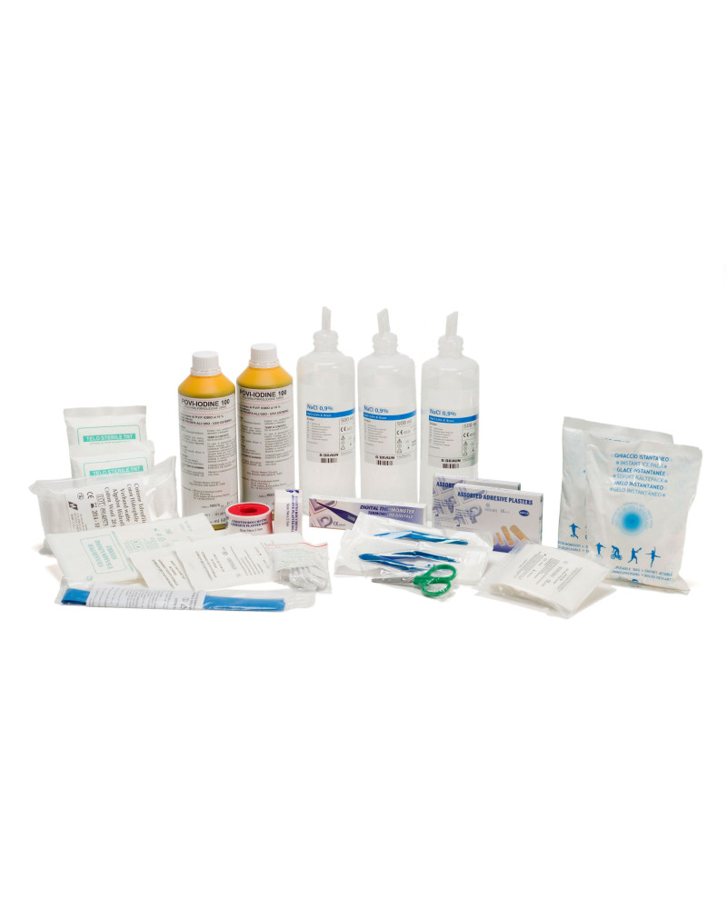 conforme all'All. 1 del D.lgs. 81/2008-D.M.388/2003 con maggiorazione Classificazione: per aziende del gruppo AB -Copia Decreto Ministeriale 81/2008 -5 paia di guanti sterili -1000 ml di sol. cutanea di iodopovidone al 10% di iodio PMC -1500 ml di soluzione fisiologica (sodio cloruro 0,9%) -10 compresse di garza sterile cm 10x20 in buste singole -2 compresse di garza sterile cm 18x40 in buste singole, -2 pinzette da medicazione sterile -1 confezione di cotone idrofilo -2 confezioni da 20 cerotti di varie misure -2 rotoli di cerotto alto cm 2,5 -2 rotoli di benda orlata alta cm 10 -1 paio di forbici tagliabendaggi cm 14 -3 lacci emostatico, -2 confezioni di ghiaccio -2 sacchetti monouso per rifiuti sanitari -1 coperta isotermica -2 stecche per frattura -1 respiratore bocca a bocca -2 bustine gel antiscottatura -1 mascherina con visiera paraschizzi -1 confezione di rete elastica di misura media -2 telo sterile cm 40x60 -1 termometro digitale Norma CE: I Dispositivi contenuti nel kit sono conformi alla CE 93/42 e al DL 24.2.97