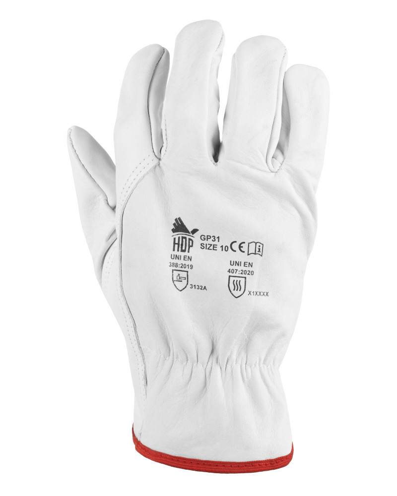 DPI 2a categoria materiale: pelle fiore top quality colore: bianco taglie: 7 - 8 - 9 - 10 - 11 Conforme UNI EN 388 (3132A) Conforme UNI EN 407 (X1XXXX) - bordato - con blister